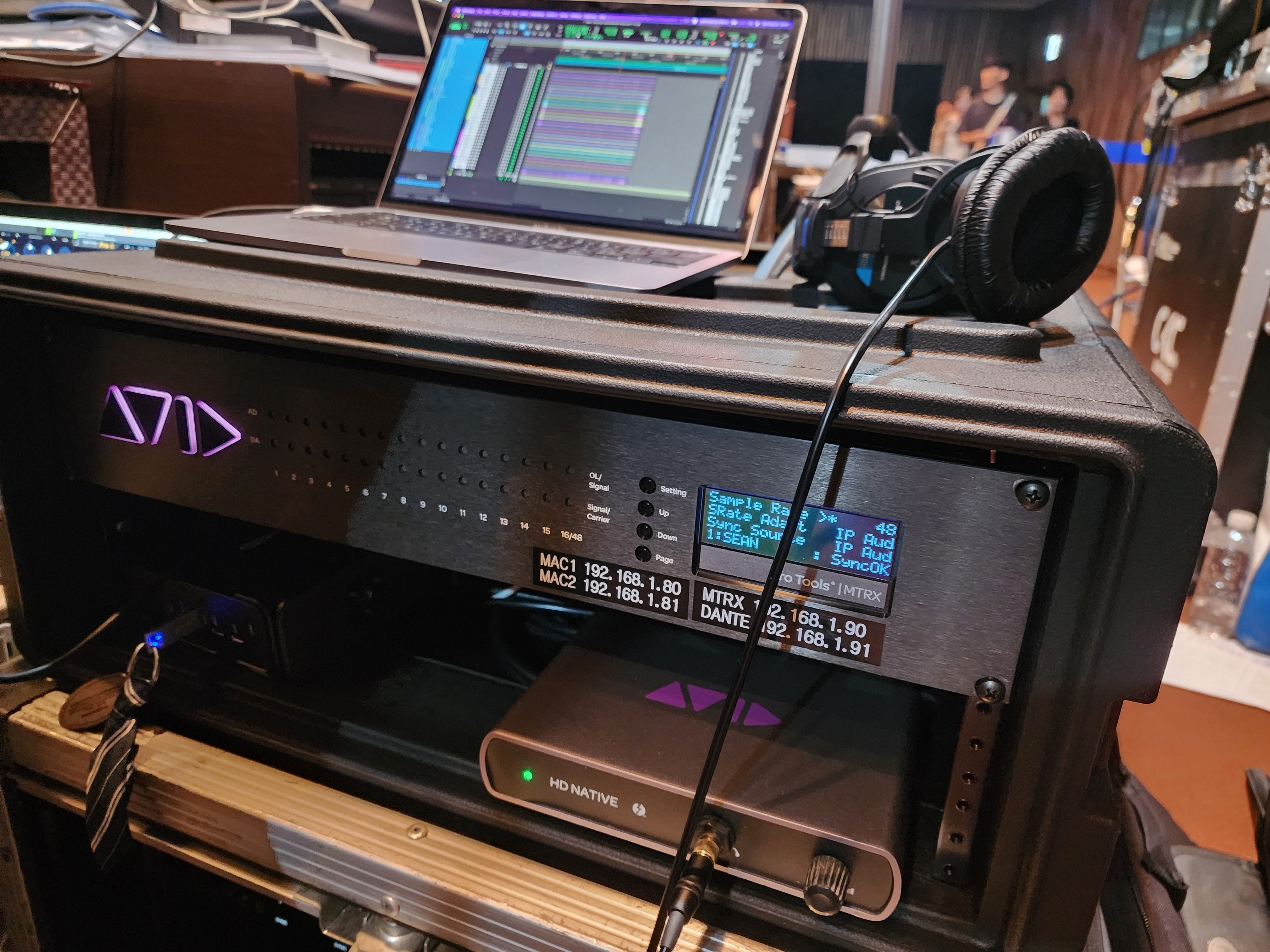 Pro Tools Ultimate에 Live Professor 환경을 구축했습니다. AVID MTRX와 RME Digiface Dante를 통해 FOH 믹스와는 완전히 독립된 멀티트랙 레코딩 경로를 확보했고, 박병하 엔지니어와 함께 이중 백업 시스템을 운영했습니다.